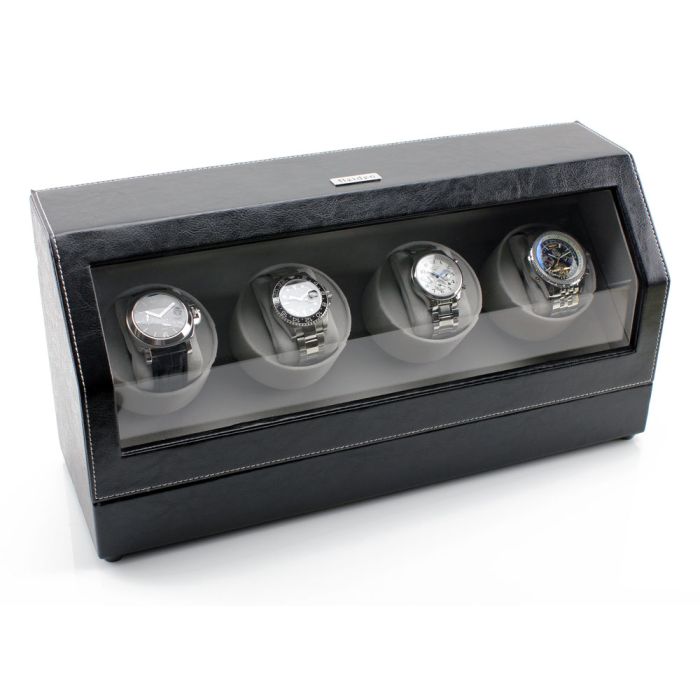 This automatic quad watch winder holds up to four watches. This watch winder is in black leather with white stitching and a clear display top that looks great anywhere in your room.
