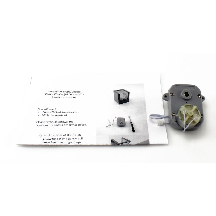The Versa watch winder replacement motor kit includes the motor and gearbox We have included step by step instructions on how to replace your motor. This kit is compatible with the VR001 and VR002 model watch winders only. A mini screwdriver is required but not included. Older version of the Versa watch winder may have a different gear box design which may require slight modification to mount the motor.